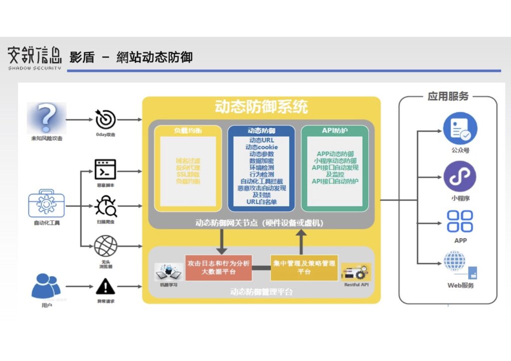 通过动态防御技术,对抗各种自动化攻击工具的入侵以及各种0day漏洞,各种越权攻击及撞库爆破攻击,包括各种终端识别和拦截能力,增强防护能力。